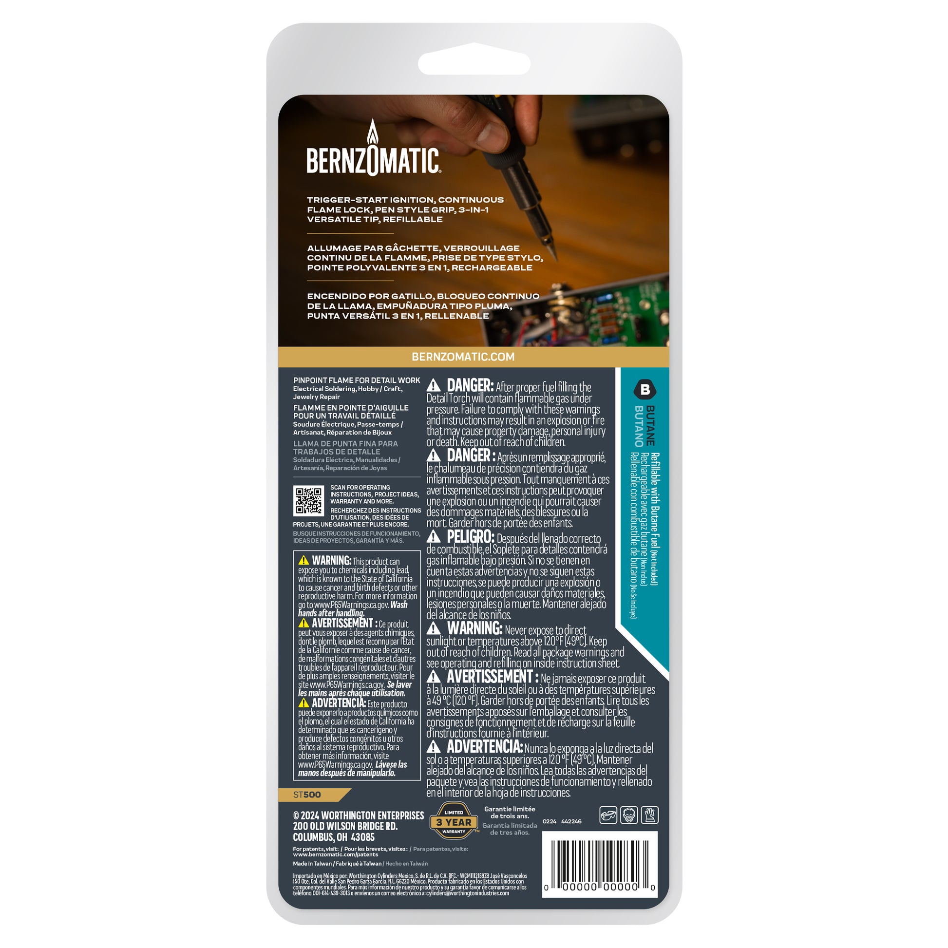 Bernzomatic warrants to the original purchaser that this product is free from defects in material and workmanship for three years from the date of purchase. This warranty is valid for all purchases of this product on or after June 1, 2016. This warranty does not apply to product that has been damaged as a result of improper maintenance, accident or other misuse, or which fails to operate due to normal wear and tear. This warranty is void if the product is repaired or modified in any way by anyone other than Bernzomatic.